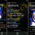 The image to the left shows the ‘now playing’ screen that you will see most of the time. The album art acts as a live tile. It flips to show more song info like artist and album, and slides down to show the name of the song. Tapping the album art will take you to a screen with more info and buying options. Under the song info is row of five album covers that show the two previous songs, current song, and two upcoming songs. Last but not least is the controls across the bottom for play/pause, skip, stations, and about.