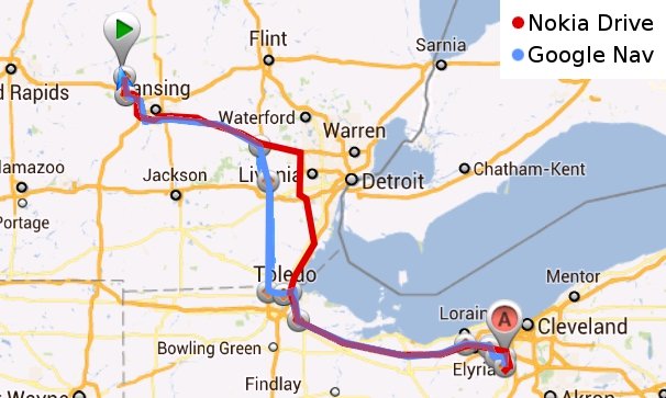 With Google Navigation it takes me 4-4.5 hours to reach my destination. With Nokia Drive it took me about 3 hours and 45 minutes. That may not seem like much, but it felt a lot quicker for some reason. The route that Nokia Drive took me on was also less stressful. There is a section of the trip that Google Nav always confuses me with. The voice says to go right but the map shows going left. Nokia Drive didn’t even take me on this section.