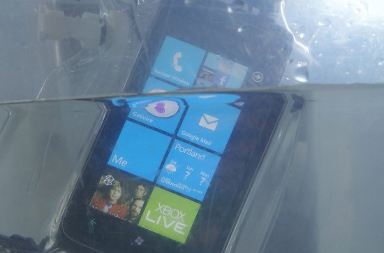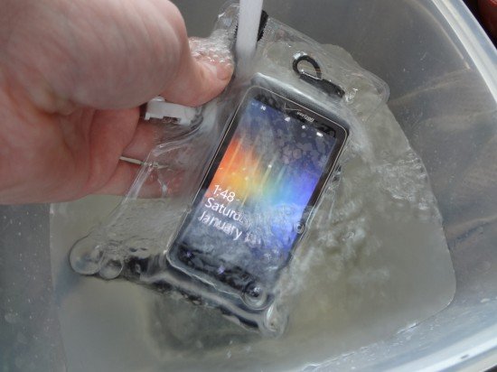 Putting my HTC Trophy inside the bag is usually pretty simple. Sometimes it can take a little jiggling since the cable doesn’t quite reach the headset jack of my phone without putting it halfway in the bag. Locking the bag can take a little muscle sometimes, but I find that makes me feel more assured that it will keep the water out. The DryCASE has plenty of room for the 3.7″ display of the Trophy, and it should fit even bigger devices.