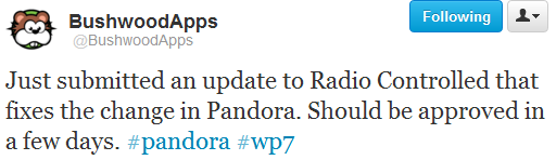 Since Pandora doesn’t have an official app for Windows Phone we have to rely on apps like Radio Controlled and MetroRadio. These apps access Pandora with undocumented APIs that give outside access to developers (read more about it in our interview with Radio Controlled developer Greg Wenograd). Pandora has once again changed the APIs and developers are scrambling to update their apps. Greg Wenograd has already sent an update for Radio Controlled in for Marketplac approval.