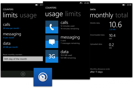 Counters is a very useful app in these times of data caps. You can track the your minutes, texts, and data usage all in the app. You can set up limits to go with whatever plan you have and then track how much you have left each month. If you have a Nokia device you should definitely check the download link below to see if you can get the app.
