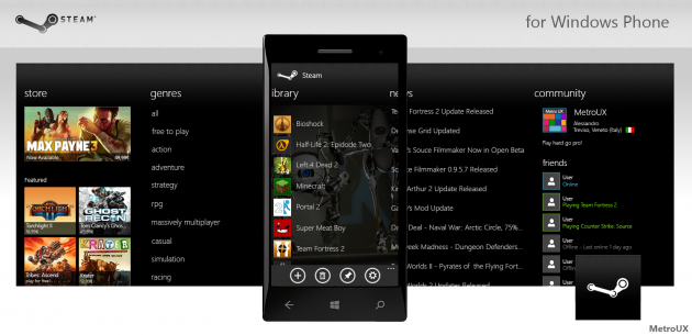 The gaming world was excited when Valve announced Steam for mobile for Android platforms, so much so that user MetroUX on Deviant Art has put together a few mock ups of what the Steam service could look like on various Windows devices. They’re definitely clean and metro-like and something most gamers would like to see, but a similar service called Steam Friends is already available. It’s more based off of the Android app than something metro all its own, though it does feature a live tile that shows you Steam’s latest updates.