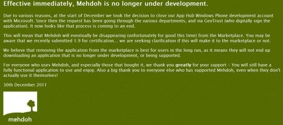 We believe that removing the application from the marketplace is best for users in the long run, as it means they will not end up downloading an application that is no longer under development, or being supported. For everyone who uses Mehdoh, and especially those that bought it, we thank you greatly for your support - You will still have a fully functional application to use and enjoy. Also a big thank you to everyone else who has supported Mehdoh, even when they don’t actually use it themselves!”