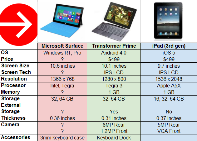 Microsft has taken a big leap into the tablet game tonight, and the immediate question is how do they stack up against the competition? We’ve compiled a chart with the specs Microsoft has released so far and put them against what Android and iOS has to offer. It’s pretty early to pick a winner, but Microsoft looks to be playing pretty serious.