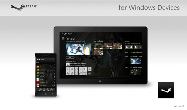 The gaming world was excited when Valve announced Steam for mobile for Android platforms, so much so that user MetroUX on Deviant Art has put together a few mock ups of what the Steam service could look like on various Windows devices. They’re definitely clean and metro-like and something most gamers would like to see, but a similar service called Steam Friends is already available. It’s more based off of the Android app than something metro all its own, though it does feature a live tile that shows you Steam’s latest updates.