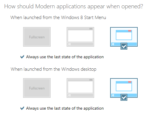 As you can see in the image above I have three Metro apps running on top of each other on the desktop. To do this ModernMix gives you a few simple settings (seen below). You can set how apps behave depending on where you launch them, and decide how certain apps open. With a simple keyboard shortcut you can even toggle between fullscreen and windowed.