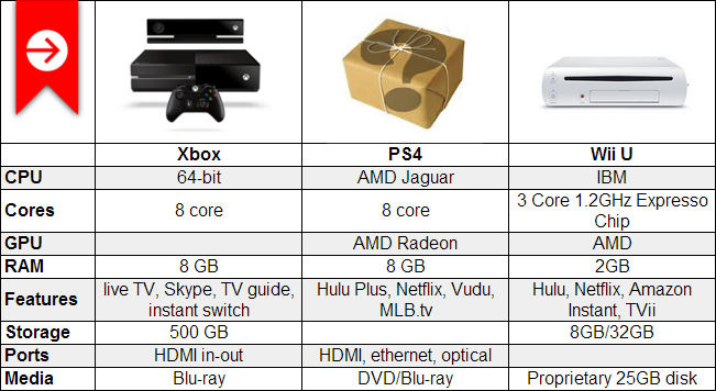 Microsoft has officially unveiled the Xbox One and revealed some of the specs for this next-gen device. Some of the specs are still unknown, but we have a pretty good idea of what this device has to offer. In the chart above we have stacked the Xbox One up against the PlayStation 4 and Wii U. These are the top three next-gen gaming consoles that will dominate the next few years.