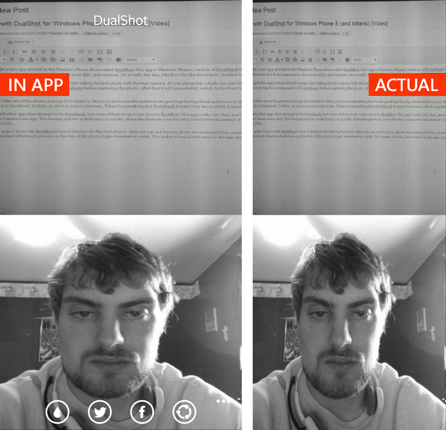 Late last night a new app arrived in the Windows Phone Store called DualShot. This app is Windows Phone’s version of Frontback for iOS. Frontback is a nifty little app that takes a photo with the rear and front cameras to show your POV and reaction. It’s a really fun app, which is why the developers decided to create DualShot.