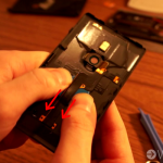 Now it is time to assemble our different parts to create our Frankenstein phone. Use the guitar pick-shaped tool to get under the strip on the phone backing. Slowly work your way down until you get the contacts that would normally connect with the charging shell. We will put the wireless charger underneath this piece. Simply line up the contact points and use electrical tape to keep it together.