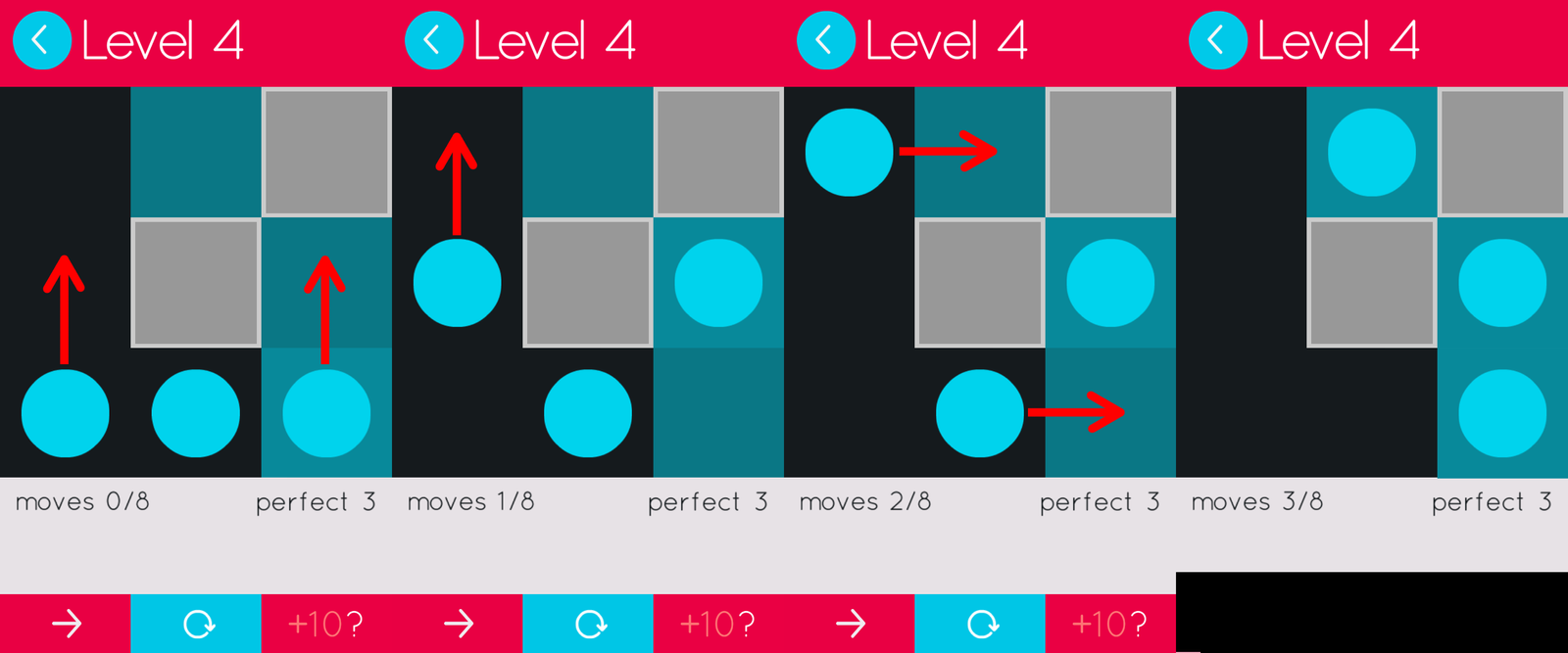 The moves are what make the game difficult. Anyone could solve the puzzles eventually with unlimited moves, but with this game there is a limit. Most of the levels have a 8 move limit and a different number for earning a perfect score. The level above, for example, required 3 moves to earn a perfect score. Get the idea?