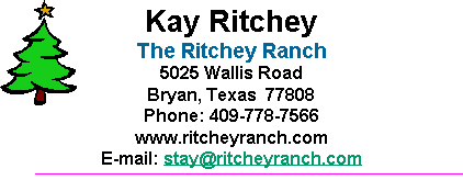 onveniently located just east of the Bryan City Limits and minutes from College Station, The Ritchey Ranch offers easy access to the many interesting sites of the local area. Texas A&M University, Easterwood Airport, and the George Bush Presidential Library are minutes away. The Messina Hof Winery is only half a mile up the road.